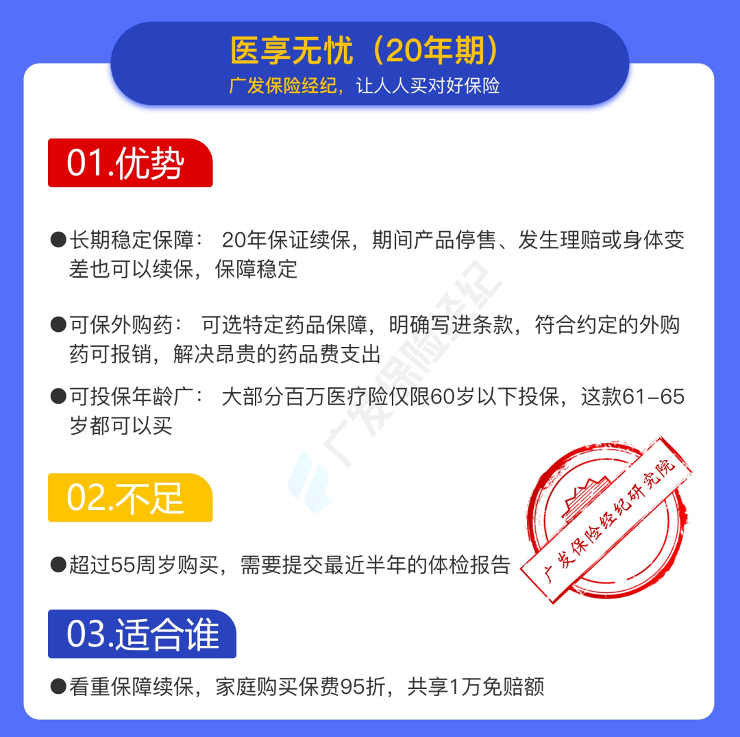 产品最大的亮点是20年保证续保,期间产品停售不会影响续保,保障长期稳定。而且还可选外购药,报销昂贵的药品费。