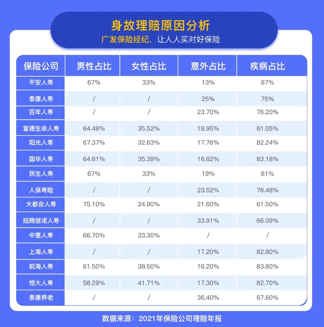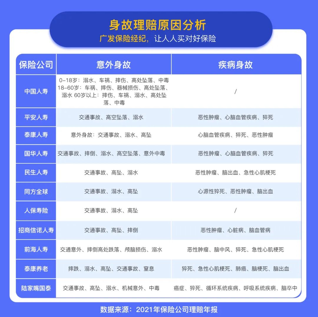 在身故赔付原因中,80%左右都因为疾病,常见疾病身故赔付原因包括:恶性肿瘤、心脑血管疾病、猝死等。