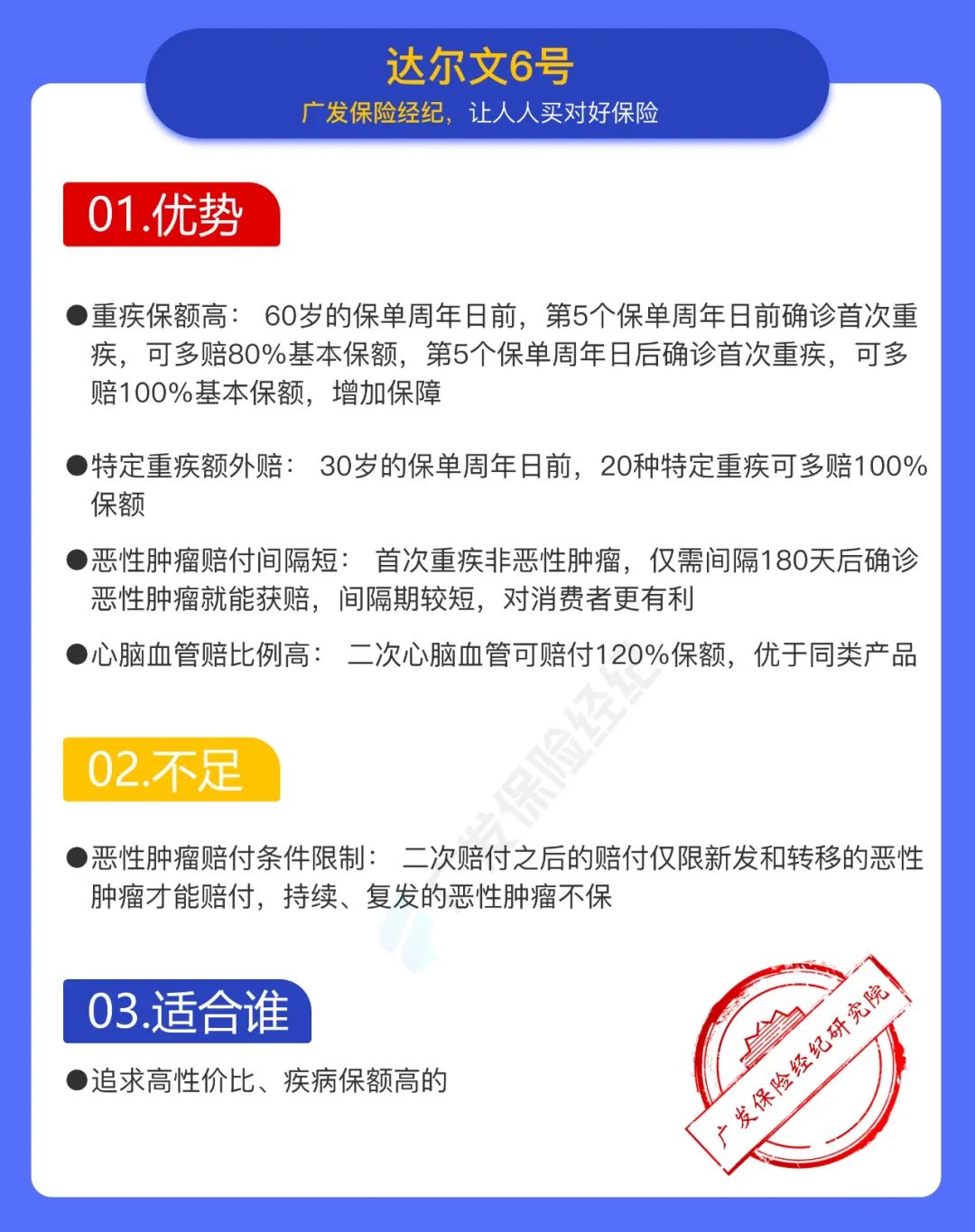 「达尔文6号」保障110种重疾,赔付1次,赔付100%基本保额。