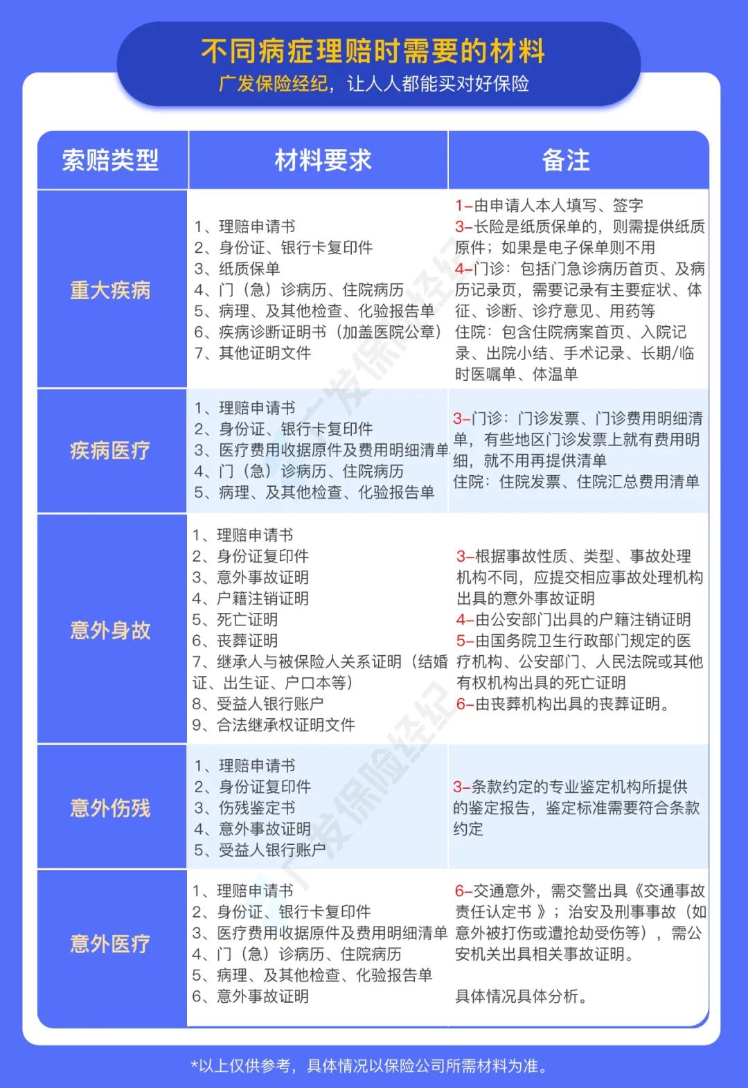 如果有多份保险要理赔,分别需要哪些材料?该怎么准备? 如果你直接找「知心赔」服务,具体材料清单会列清楚发给你。不然就得自己打保险公司客服电话问或到官网查询了。 下面整理了不同索赔情况需要的材料,建议把它打印出来,和保单放在一个文件夹里。